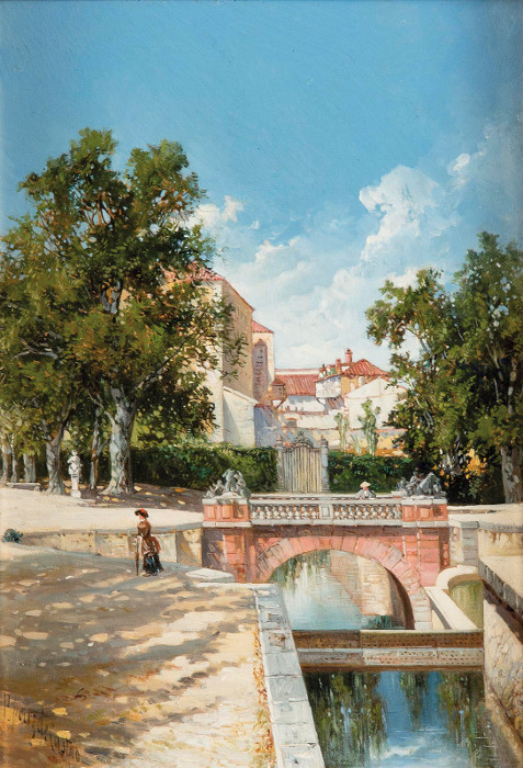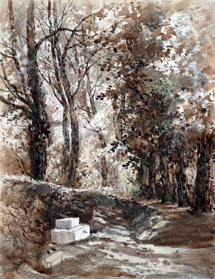 Es entonces cuando se dedica plenamente a la pintura de acuarelas y a la litografía. Sus temas serán, siguiendo la moda del momento, el paisaje de montañas y florestas sacado del natural. «Se aspira a copiar la naturaleza, embelleciéndola sin alterarla con exageraciones que la desfiguren, para darle en el lienzo nueva vida con la suavidad de las tintas, los tonos calientes, la franqueza de la ejecución, la magia de los aires interpuestos, y las fascinaciones de las perspectivas aéreas», en palabras de E. Arias Anglés («Pintura romántica española» en Pinturas de paisaje del Romanticismo Español, Madrid 1985). Además de la influencia de la acuarela inglesa, es patente la de David Roberts y la de Villaamil, especialmente por los temas y escenarios adoptados. No incluye ese elenco de personajes y grupos que configuran la escenografía de dichos pintores, ni tienen sus arquitecturas la misma monumentalidad, cosa que no parece pretender.
